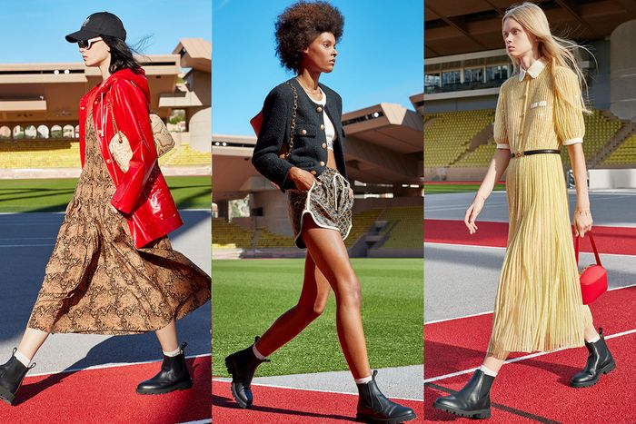 So it was curious to see the film of his new women’s collection. It opens with a drone shot of the blue Mediterranean, then a pan of Monaco’s famous, yacht-filled harbor and some of the most expensive real estate on the planet. Next, the camera zooms over a manicured green space, makes several quick rotations, and then, like a giddy bumblebee, hovers in front of a beautiful woman before it finally pulls back to reveal our location — a sports stadium (minus, of course, the spectators).
