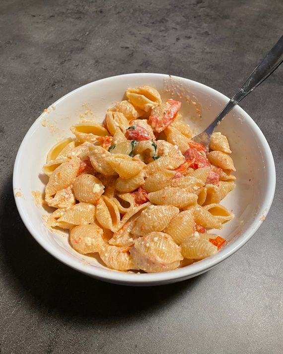 I take a spoon and break open the cheese block. It pulls apart and begins to melt in such a satisfying way that it can only be compared to breaking open a chocolate molten lava cake at a fancy restaurant. I pour in the pasta and sprinkle the chopped basil leaves on top. It smells delicious, and I am starving. I serve it up into my bowl, grab a fork, and sit down to begin eating when a thought occurs to me: Do I add Parmesan? Is that an insane idea? Adding Parmesan is a mandatory step to finishing off any pasta dish, but this one? I don’t know how the feta and Parm would interact, and after all, Ayeh never mentions it. It’s decided, this pasta will be Parmesan free. Comfortable with my decision, I finally taste TikTok’s favorite meal …