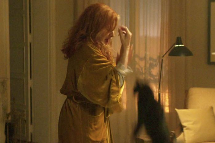 Pfeiffer plays a wealthy Manhattan widow named Frances Price, whose recent bankruptcy drives her to liquidate her assets and hole up inside a friend’s empty Parisian apartment with her apathetic son (Lucas Hedges) and her (possessed?) cat. Price spends her days plowing through her cash and swanning around in an absolutely incredible robe. Let me tell you more about this garment: It is ankle-length, and velvet, and sits at the intersection of sunflower and chartreuse — a color that effectively mirrors Price’s plush and acidic mind. As an expression of her ennui, the robe is unparalleled, a mantel of affluent boredom for an over-it socialite who probably isn’t going to bother getting dressed for you. She spends approximately half the movie looking like the Sun King while engaging in such regular activities as opening the mail: